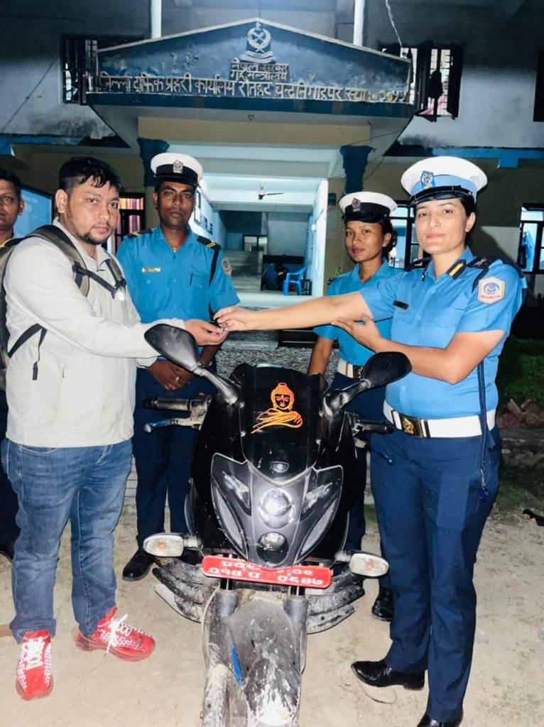 चन्द्रपुर । ललितपुरबाट चोरी भएको मोटरसाइकल रौतहट जिल्लामा फेला परेको छ। यहीँ असोज ३० गते दिउँसो ललितपुरको महालक्ष्मी नगरपालिका वडा नं. ५ टिकाथली राधाकृष्ण चोकमा पार्किङ गरी राखेको प्रदेश ३ –०२–०१४ प ०६४७ नम्बरको निलो कालो रंगको २२० सिसिको बजाज कम्पनीको पल्सर मोटरसाइकल जिल्ला ट्राफिक प्रहरी कार्यालय रौतहटको टोलीले चन्द्रनिगाहपुरबाट फेला पारेर मोटरसाइकल धनी भोजपुरका आशिष लकान्द्रीलाई बुझाएको छ । कार्यालय प्रमुख प्रहरी निरीक्षक विमला कुमारी कठायतले मोटरसाइकल धनी लकान्द्रीलाई बुझाएकी हुन् । जिल्ला ट्राफिक प्रहरी कार्यालय रौतहट चन्द्रनिगाहापुरको चेक पोईन्टमा ३० गते रातिनै ११ बजेको ट्राफिक प्रहरीले चेकजाँच गर्ने क्रममा फेला सो मोटरसाइकल फेला परेको प्रहरी निरीक्षक कठायतले जानकारी दिइन्। उनका अनुसार मोटरसाइकलमा चोर ट्राफिक प्रहरीलाई देखेपछि मोटरसाइकल सोही स्थानमा छाडेर फरार भएका थिए। चोरी भए लगत्तै प्रहरी वृत्त सातदोबाटो ललितपूरमा निवेदन दिएका लकान्द्रीले आफुले हराएको २४ घण्टा भित्रै मोटरसाइकल पुनः प्राप्त गरेकोमा खुसी व्यक्त गर्दै जिल्ला ट्राफिक प्रहरी कार्यालय रौतहटको टोलीलाई विशेष धन्यवाद दिए । ललितपुर देखि रौतहटसम्म आइपुग्दा धेरै स्थानहरुमा जनपथ प्रहरी तथा ट्राफिक प्रहरीको चेक पोइन्ट भएपनि ती सबै स्थानहरू छलेर चोरीको मोटरसाइकल रौतहटसम्म कसरी आइपुग्यो चासोको विषय बनेको छ।