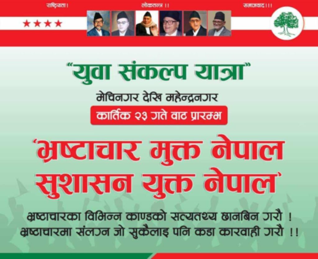 रौतहट २८ कार्तिक । नेपाली कांग्रेसको मेची–महाकाली ‘युवा संकल्प यात्रा’ टोलीले रौतहटको चन्द्रनिगाहपुरमा एक कार्यक्रम गरेको छ । मेचीनगर बाट शुरु भएकोे दश बुँदे एजेण्डा सहित को यात्रा गत कार्तिक २३ गते काँकडभिट्टाबाट प्रारम्भ भएको मेची–महाकाली ‘युवा संकल्प यात्रा’ बुधबार चन्द्रनिगाहपुर आइपुगी एक कार्यक्रम गरेर पुन पश्चिम यात्रामा तर्फ लागेको छ । चन्द्रनिगाहपुरमा आयोजित संकल्प यात्रा कार्यक्रममा नेबीसंघका पुर्ब केन्द्रिय अध्यक्ष तथा संबिधान सभा सदस्य रन्जित कर्ण, नेपाल तरुण दल केन्द्रिय महासचिब भुपेन्द्रजङ्ग शाही नेबिसंघका केन्द्रिय सदस्य प्रेमिका राना मगर लगायत नेबिसंघका केन्द्रिय नेताहरुको सहभागिता रहेको कार्यक्रमलाई नेपाली काग्रेस चन्द्रपुरका नेता नरेश लामिछानेले संचालन गर्नु भएको थियो भने नेपाली काग्रेस मधेश प्रदेश सदस्य पार्टी प्रबक्ता सुर्य बहादुर थापाले कार्यक्रमलाई समापन गर्नु भएको थियो । मंसिर ४ गते महाकाली पुगेर समापन गरिने यात्राको उदेश्य युवालाई लोकतन्त्र, विधिको शासन, युवा हकहित र जनअधिकारका पक्षमा ऐक्यबद्धता जनाउँदै समृद्ध नेपाल निर्माणका लागि उद्यमशील बन्न प्रेरित गर्ने रहेको नेपाली काग्रेसका युवा नेता शम्भु थापाले बताए । कार्यक्रममा रौतहटका नेपाली काग्रेसका नेता कार्यकर्ताहरुको बाक्लो उपस्थिति रहेको थियो । कार्यक्रमको उद्देश्य रोजगारी सुनिश्चितताका लागि दबाव सिर्जना गर्ने, सुशासनका लागि खबरदारी गर्ने तथा मूल्यवृद्धि नियन्त्रणको विषय प्रखर रूपमा उठाउनुको साथै सहकारी पीडितलाई तत्काल राहत र बचत फिर्ता गराउन पहलकदमी लिने तथा विभिन्न संस्था तथा सहकारी ठगलाई कारबाही गर्न दबाव समेत सिर्जना गर्ने रहेको जनाइएको छ ।
