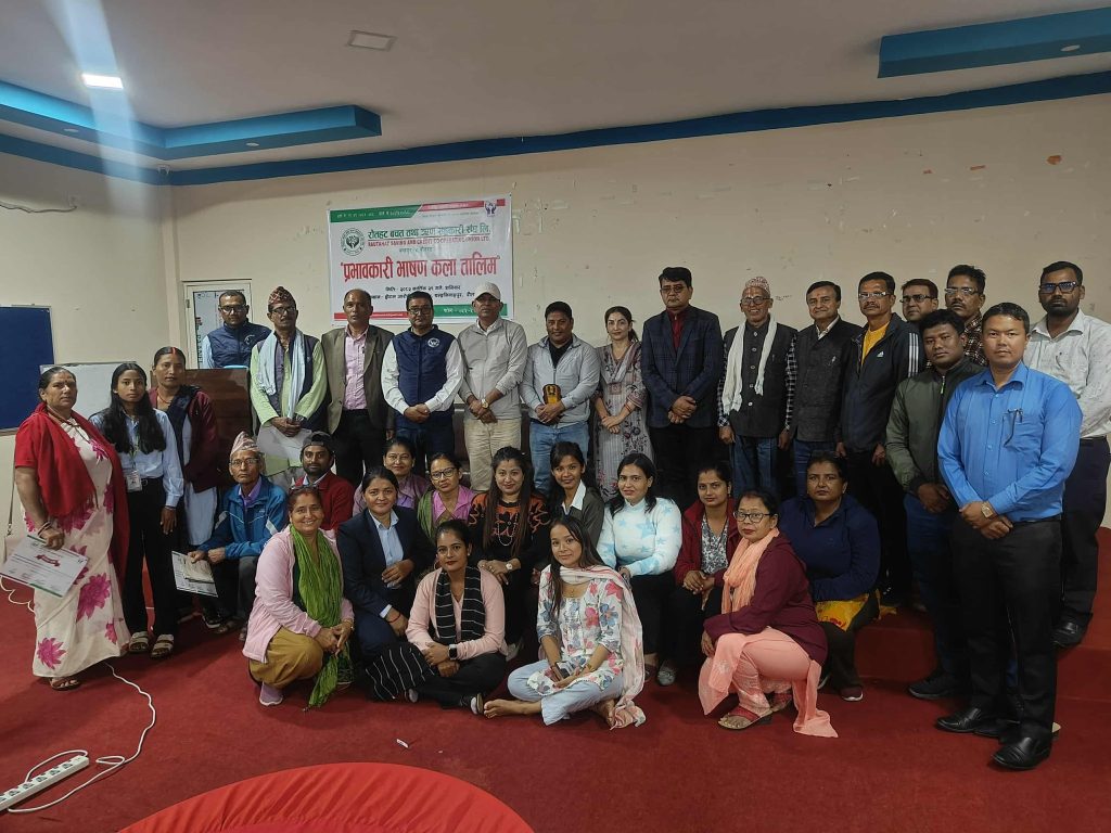 चन्द्रपुर÷रौतहट बचत तथा ऋण सहकारी संघ लि ले प्रारम्भिक सस्थाका संचालक तथा कर्मचारी लक्षित “प्रभाबकारी भाषण कला तालिम “कार्तिक २९ गते शनिबार चन्द्रपुर ४ स्थित आरोही होटलको सभाहलमा सम्पन्न गरेको छ । कार्यक्रमको उद्घाटन संघका अध्यक्ष विभु पोखरेलले गर्नुभएको थियो । कार्यक्रममा स्वागत मन्तव्य संघका सचिब वसन्त आचार्यले दिनुभएको थियो । संघले १२ महिना १२ कार्यक्रम गर्ने नीति अनुसार तालिमको आयोजना गरेको होे । बोल्नु एउटा कला हो बोल्दा मर्यादाक्रम अनुसारको सम्बोधन , बिषय बस्तुको उठान ,ब्याख्या ,सन्देश प्रवाह ,निचोड र शब्द चयनको चातुर्यता , जस्ता कुरामा ध्यान दिन आबास्यक पर्ने हुदा सबैले सहजै र निर्भीक रुपमा कार्यक्रम संचालन र भावना व्यक्त गर्ने क्षमताको बिकास होस भनेर यो कार्यक्रमको आयोजना गरिएको संघका कोषाध्यक्ष नरेन्द्र रानाले बताउनुभयो । कार्यक्रममा ४० सहकारीकर्मीको उपस्थिति रहेको थियो । कार्यक्रमको समापन समारोहमा चन्द्रपुर नगरपालिकाका प्रमुख सन्जय कुमार काफ्लेको आतिथ्यतामा सहभागीहरुलाइ प्रमाणपत्र प्रदान गरिएको थियो । समापन समारोहमा मन्तव्य राख्नुहुदै चन्द्रपुर नगरपालिकाका नगर प्रमुख काफ्लेले सहकारीको बिकास र प्रबद्र्धनमा सहकारी शिक्षा तथा तालिमको माध्यमबाट गरिने कार्यलाई निरन्तरता दिन संघलाई सुझाउनुको साथै आबश्यक सहयोग गर्ने बचनबद्धता व्यक्त गर्नुभयो । सहजकर्ता शोभा खरेलले सहभागीहरुलाइ अति नै उत्साहजनक र प्रयोगात्मक तवरबाट हौसला थप्दै बिबिध बिषयमा आफ्ना ज्ञान र विद्धता प्रदान गर्नु भएको थियो । सहभागीताको तर्फबाट बिन्दबासिनी साकोसका सचिब राजेन्द्र तिमल्सिना र शसक्त महिला साकोसकी ब्यबस्थापक पार्वती राइले कार्यक्रम आयोजना गरेकोमा संघलाई र प्रभावकारी ढंगले सहजीकरण गरेकोमा सहजकर्ता शोभा खरेलप्रती आभार व्यक्त गर्नुभयो । कार्यक्रम संघका महासचिव देव बहादुर सापकोटाले संचालन गर्नु भएको थियो ।