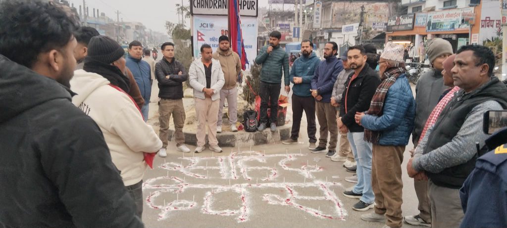 चन्द्रपुर,१६ माघ÷चन्द्रनिगाहपुर सिटी जेसिजले शहीद दिवसको अवसरमा चन्द्रपुर चोकमा झण्डोत्तोलन गर्नुका साथै दिपप्रज्ज्वलन गरेको छ । चन्द्रपुर निवासी समाजसेवी भरत अधिकारी तथा जिल्ला ट्राफिक प्रहरी कार्यालय चन्द्रनिगाहपुरका प्रमुख प्रहरी निरिक्षक राजेन्द्र थापा मगर, चन्द्रनिगाहपुर सिटी जेसिज २०२६ का अध्यक्ष देवराज न्यौपाने लगायतले संयुक्त रुपमा झण्डोत्तोलन गर्नुभयो । झण्डोत्तोलनपछि चन्द्रनिगाहपुर सिटी जेसिज २०२६ का अध्यक्ष देवराज न्यौपानेले हामीले प्राप्त गरेको अधिकार ल्याउनका लागि आफ्नो जीवन बलिदान दिने शहीदको सम्झनामा झण्डोत्तोलन गरिएको बताउनुभयो । उहाले विभिन्न कालखण्डमा देश र जनताको लागि आफ्नो ज्यान आहुति दिने शहीदको सपना साकार गर्नु सवैको कर्तव्य रहेको बताउनुभयो । कार्यक्रममा चन्द्रनिगाहपुर सिटी जेसिजका पुर्व अध्यक्ष चिरन्जीवी गौतम,चन्द्रपुर निवासी समाजसेवीद्धारा भरत अधिकारी,जिल्ला ट्राफिक प्रहरी कार्यालय चन्द्रनिगाहपुरका प्रमुख प्रहरी निरिक्षक राजेन्द्र थापा मगर लगायत चन्द्रनिगाहपुर सिटी जेसिजका पदाधिकारी,व्यवसायी,स्थानीयको सहभागिता रहेको थियो । झण्डोत्तोलनको लागि आवश्यक सहयोग चन्द्रनिगाहपुर सिटी जेसिज २०२६ का उपाध्यक्ष तथा कार्यक्रम संयोजक विकिज घिमिरेले गर्नुभएको थियो ।